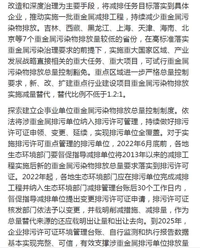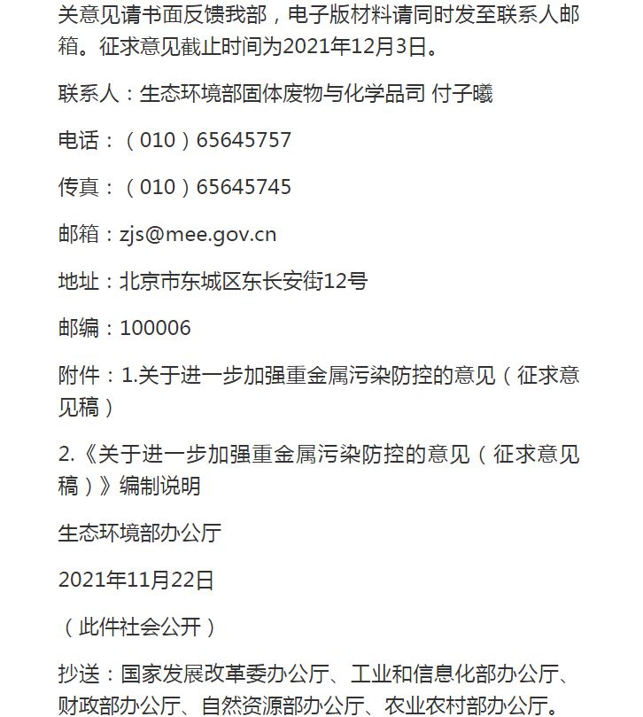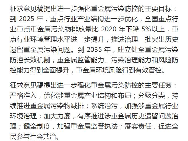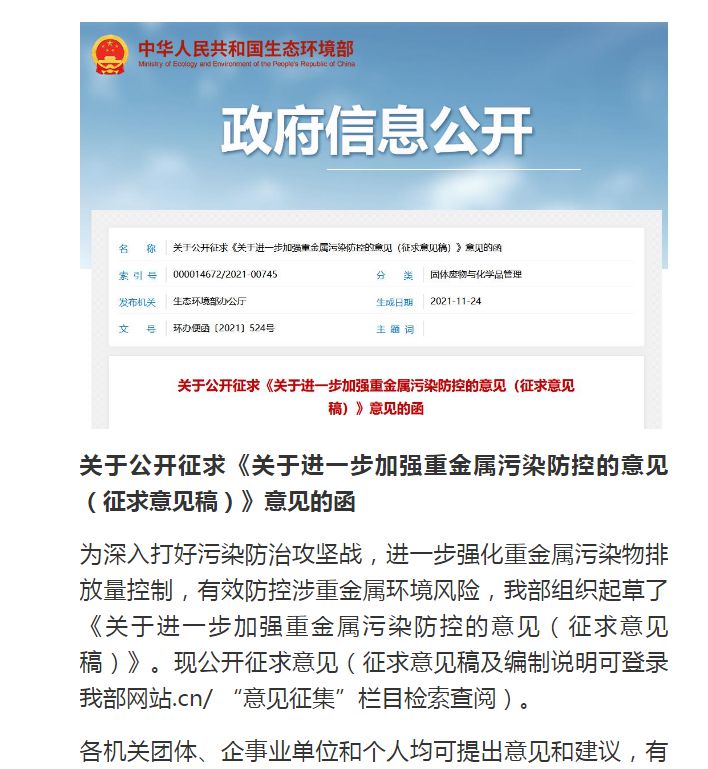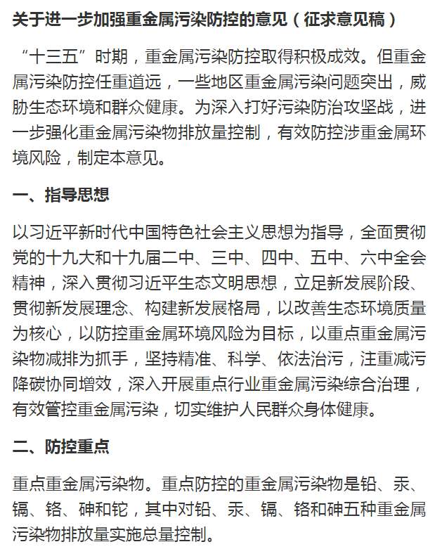 生态环境部公布《关于进一步加强重金属污染防控的意见(征求意见稿)》