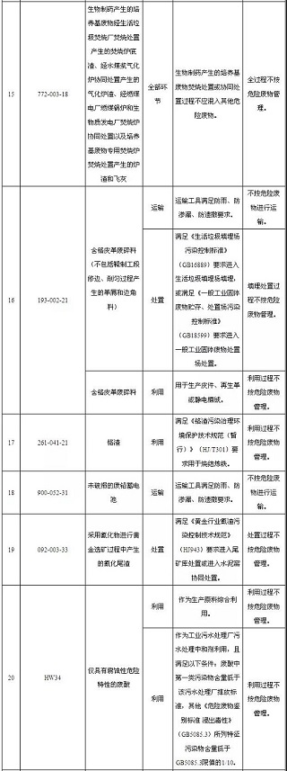 本清单各栏目说明:1.“序号”指列入本目录危险废物的顺序编号;2.“废物类别/代码”指列入本目录危险废物的类别或代码;3.“危险废物”指列入本目录危险废物的名称;4.“豁免环节”指可不按危险废物管理的环节;5.“豁免条件”指可不按危险废物管理应具备的条件;6.“豁免内容”指可不按危险废物管理的内容;7.《医疗废物分类目录》对医疗废物有其他豁免管理内容的,按照该目录有关规定执行;8.本清单引用文件中,凡是未注明日期的引用文件,其最新版本适用于本清单。
