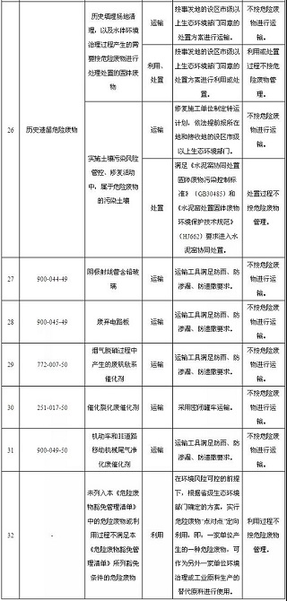 1. “点对点”定向利用豁免是出于何种考虑?如何操作实施?答:豁免管理制度在2016年版《名录》中首次提出后,对促进危险废物利用发挥了积极作用。但危险废物种类繁多,利用方式多样,难以逐一作出规定,需要各地结合实际实行更灵活的利用豁免管理,进一步推动危险废物利用。因此,《名录》特别提出“在环境风险可控的前提下,根据省级生态环境部门确定的方案,实行危险废物‘点对点’定向利用”。生态环境部2019年印发实施《关于提升危险废物环境监管能力、利用处置能力和环境风险防范能力的指导意见》后,山东、江苏等地已经探索开展了危险废物“点对点”定向利用豁免管理相关工作,效果良好。下一步,在“点对点”定向利用豁免管理实施过程中,各省级生态环境部门可结合本地实际制定实施细则,组织开展相关工作。2. 列入《名录》豁免清单中的废物是否不属于危险废物?答:《危险废物豁免管理清单》仅豁免了危险废物特定环节的部分管理要求,并没有豁免其危险废物的属性。3. 附录《危险废物豁免管理清单》中豁免内容的具体含义是什么? 答:《危险废物豁免管理清单》的“豁免内容”指可不按危险废物管理的内容。其具体含义如下:1)全过程不按危险废物管理:全过程均豁免,各管理环节无需执行危险废物环境管理规定。需要强调,除“全过程不按危险废物管理”的情景下的危险废物转移过程,以及收集过程豁免条件下危险废物收集并转移到集中贮存点的转移过程可不运行转移联单外,其他豁免情景下转移危险废物的,均需运行危险废物转移联单。2)收集过程不按危险废物管理:满足《名录》豁免清单规定的收集豁免条件,收集单位可不需要持有危险废物收集许可证,收集并转移至集中贮存点的转移过程可不运行转移联单;集中收集后的贮存以及其他环节仍按照危险废物进行管理。3)利用过程不按危险废物管理:满足《名录》豁免清单规定的利用豁免条件,利用企业可不需要持有危险废物综合许可证;需运行转移联单,且在利用企业内的贮存等其他环节仍按照危险废物进行管理。4)填埋(或焚烧)处置过程不按危险废物管理:满足《名录》豁免清单规定的填埋(或焚烧)处置豁免条件,填埋(或焚烧)处置企业可不需要持有危险废物综合许可证,填埋(或焚烧)的污染控制执行豁免条件规定的要求;需运行转移联单,且在处置企业内的贮存等其他环节仍按照危险废物进行管理。5)水泥窑协同处置过程不按危险废物管理:满足《名录》豁免清单规定的水泥窑协同处置豁免条件,水泥企业可不需要持有危险废物综合许可证,协同处置过程的污染控制执行豁免条件规定的要求;需运行转移联单,且在处置企业内的贮存等其他环节仍按照危险废物进行管理。6)不按危险废物进行运输:运输过程可不按危险货物运输,运输过程的污染控制执行豁免条件规定的要求;需运行转移联单。4. 对于满足利用或处置豁免的危险废物,如在利用或处置前,交由另外一家企业进行预处理,预处理环节是否豁免?另外,豁免的处置环节产生的废物是否适用衍生原则?答:《名录》第三条规定“列入本名录附录《危险废物豁免管理清单》中的危险废物,在所列的豁免环节,且满足相应的豁免条件时,可以按照豁免内容的规定实行豁免管理”,预处理环节不在所列的豁免环节,因此,该环节不能豁免。另外,《危险废物豁免管理清单》仅豁免了危险废物特定环节的部分管理要求,并不是豁免其危险废物属性。因此,豁免的处置环节产生的废物仍应按照《国家危险废物名录》《危险废物鉴别标准》(GB5085.1~7)《危险废物鉴别技术规范》(HJ 298)等确定其危险废物属性。危险废物豁免管理清单