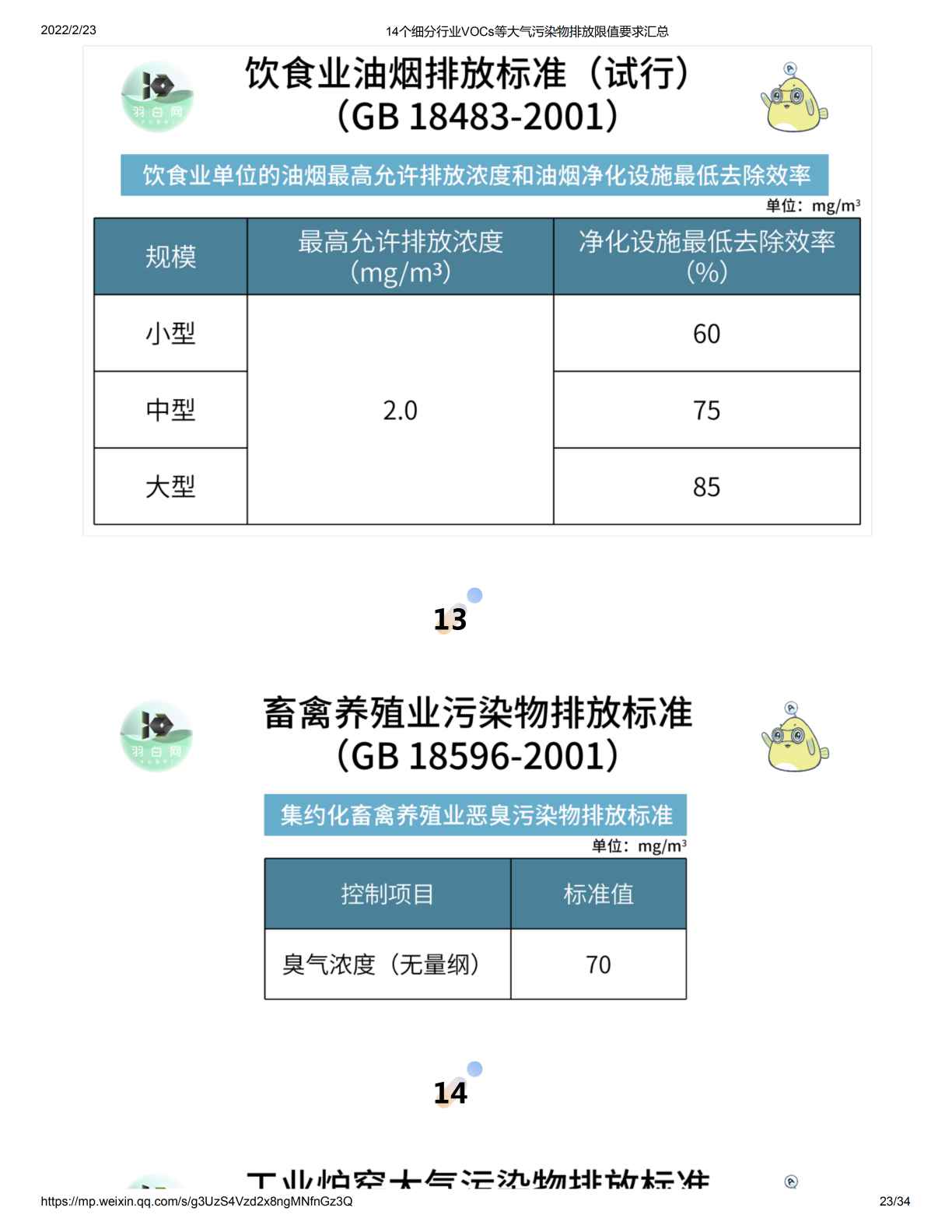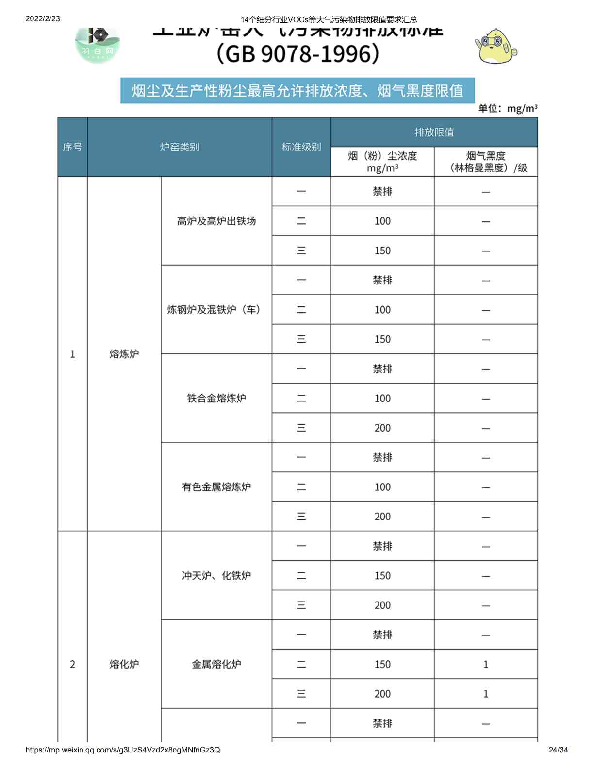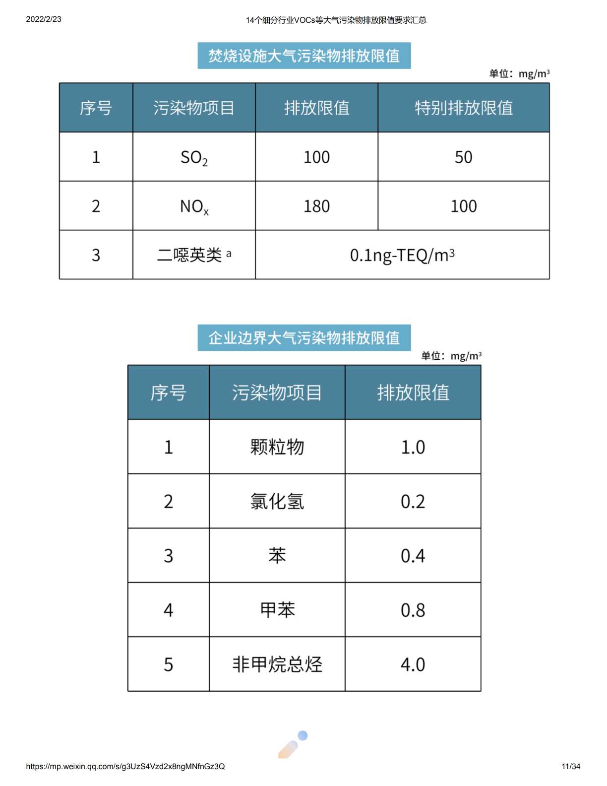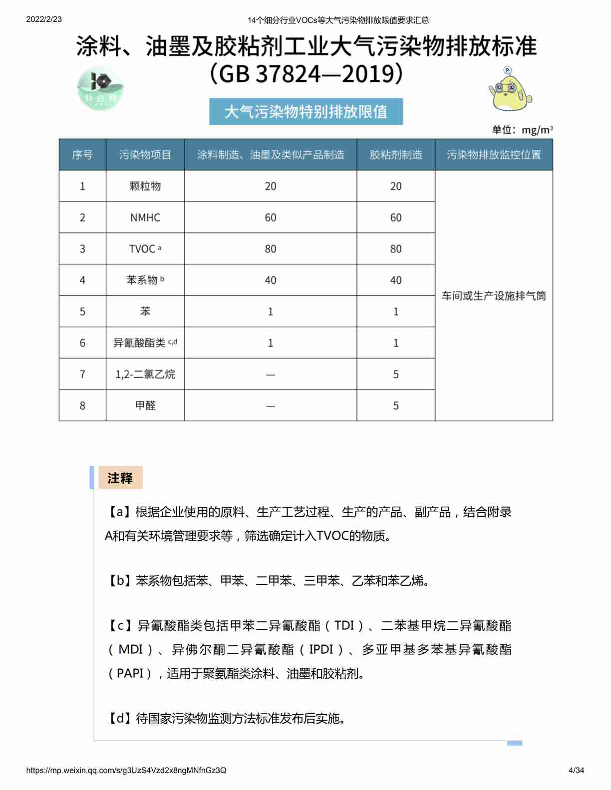 14个细分行业VOCs等大气污染物排放限值要求汇总