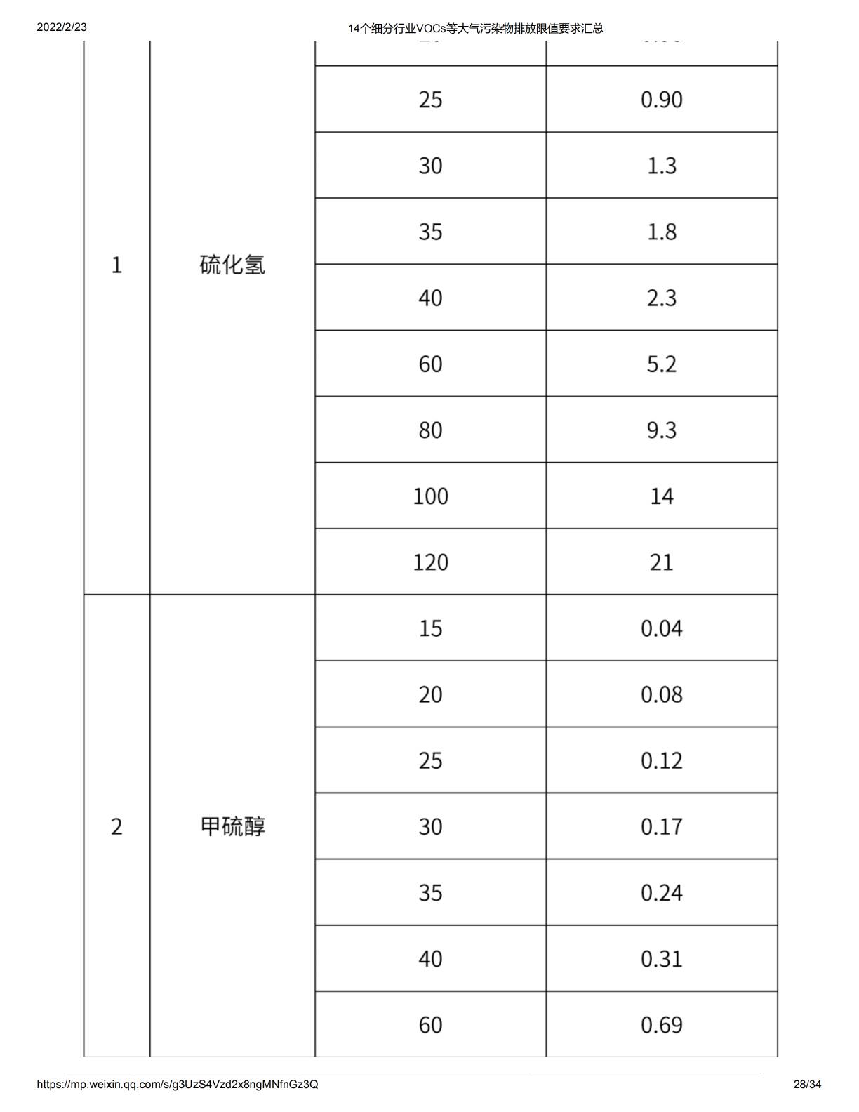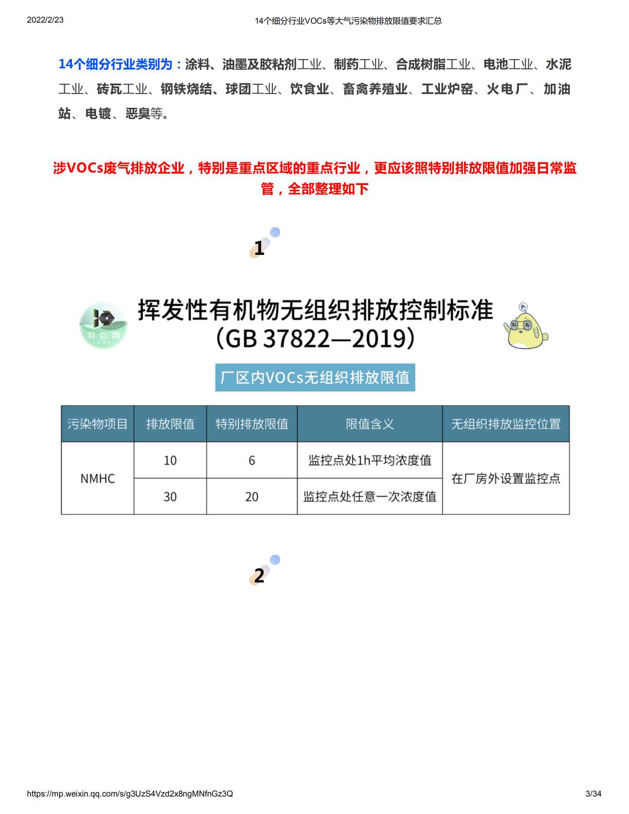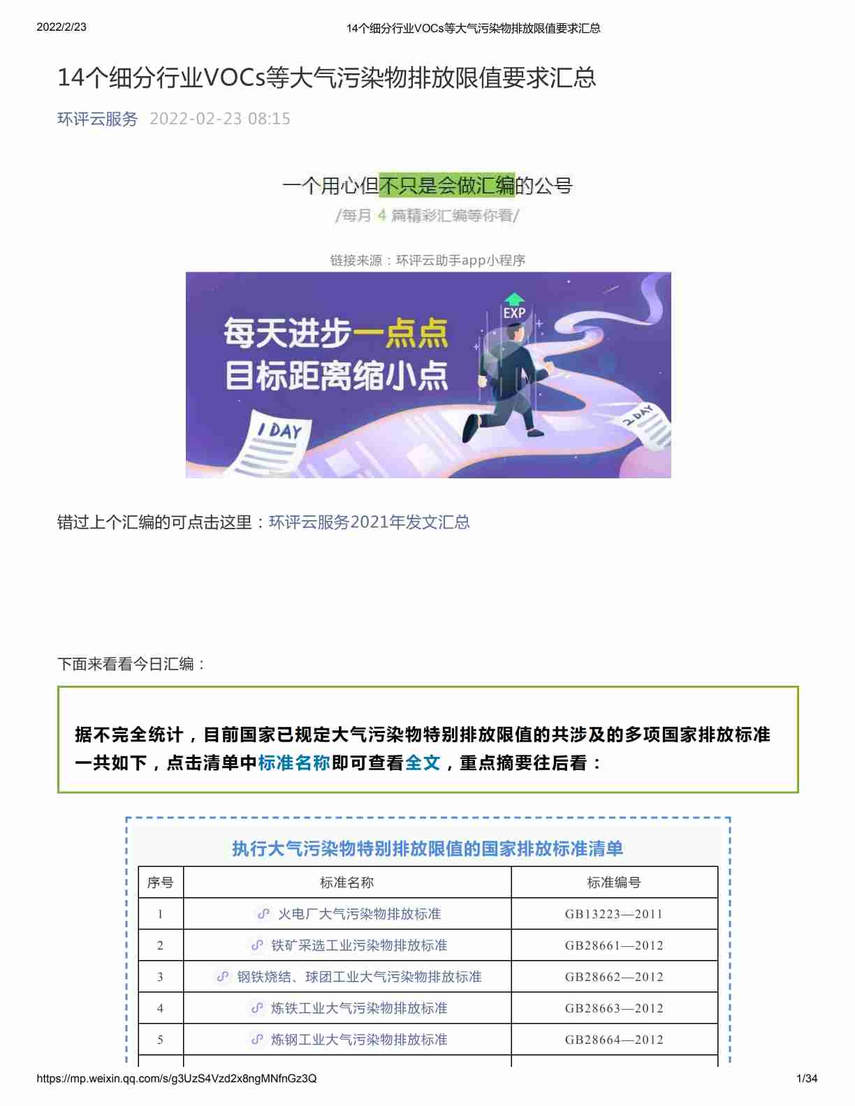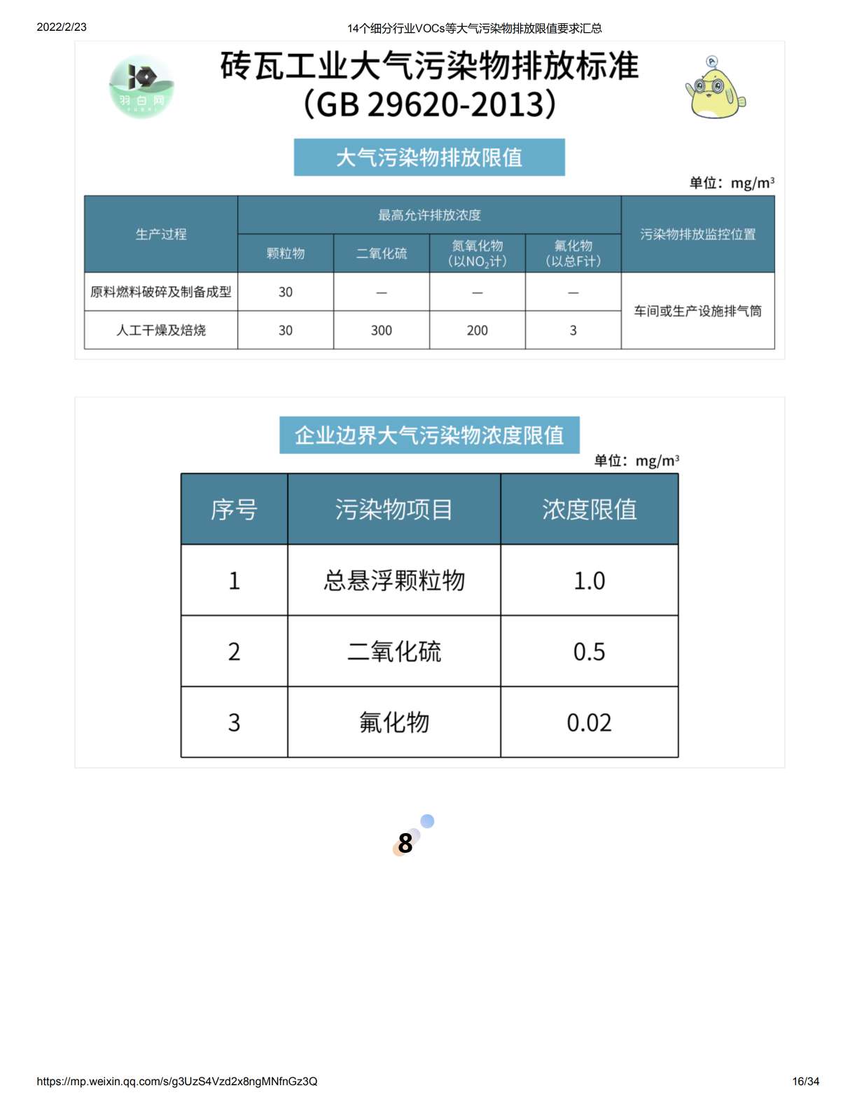 14个细分行业VOCs等大气污染物排放限值要求汇总