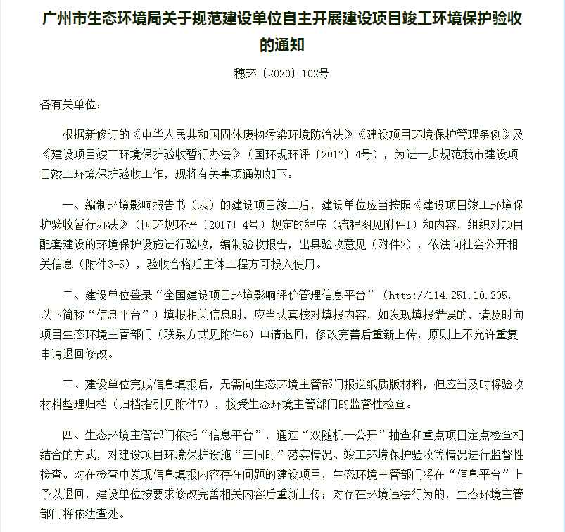 广州市生态环境局关于规范建设单位自主开展建设项目竣工环境保护验收的通知