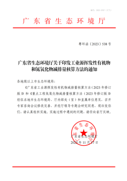 广东省生态环境厅关于印发工业源挥发性有机物 和氮氧化物减排量核算方法的通知